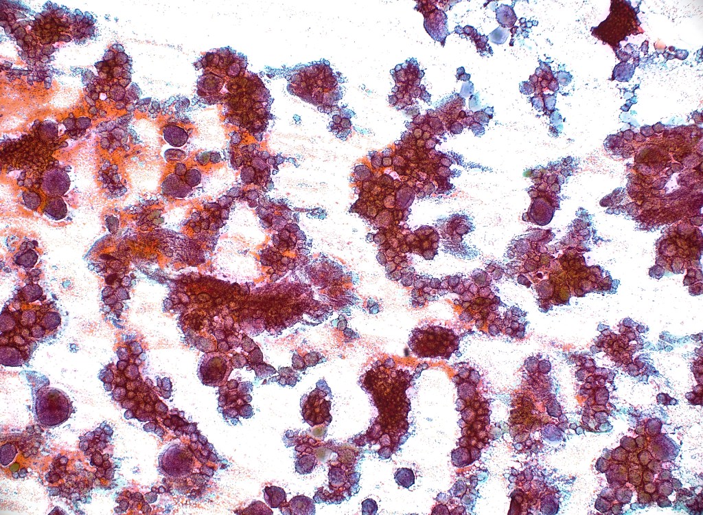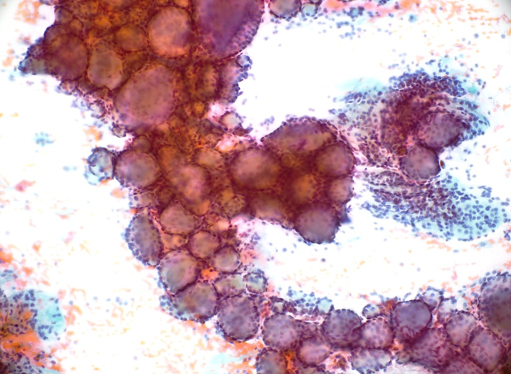 A 32-year-old woman presents with a 1.8 cm right thyroid nodule. On ultrasound, the nodule is solid, hypoechoic, and demonstrates microcalcifications. Fine-needle aspiration is performed under ultrasound guidance.