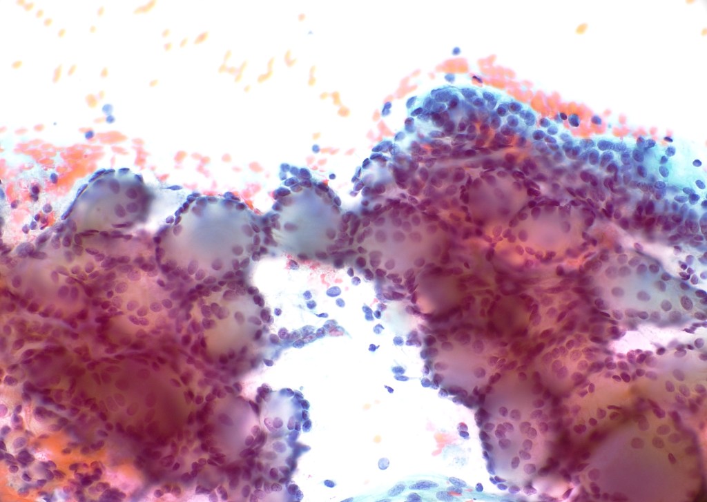 Clinical History A 32-year-old woman presents with a 1.8 cm right thyroid nodule. On ultrasound, the nodule is solid, hypoechoic, and demonstrates microcalcifications. Fine-needle aspiration is performed under ultrasound guidance. Cytologic Features Interpretation Features consistent with papillary thyroid carcinoma (Bethesda Category VI – Malignant) Making the Diagnosis The diagnosis is supported by a moderately cellular…